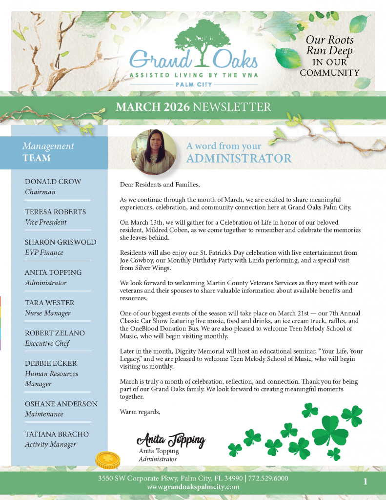 Every month, Grand Oaks of Palm City releases a community newsletter, the Grand Oaks Leaflet, for our residents and their families to read and enjoy. Each newsletter has a featured article about one of our cherished residents, so be sure to keep a look out for your loved one in the Grand Oaks Leaflet!